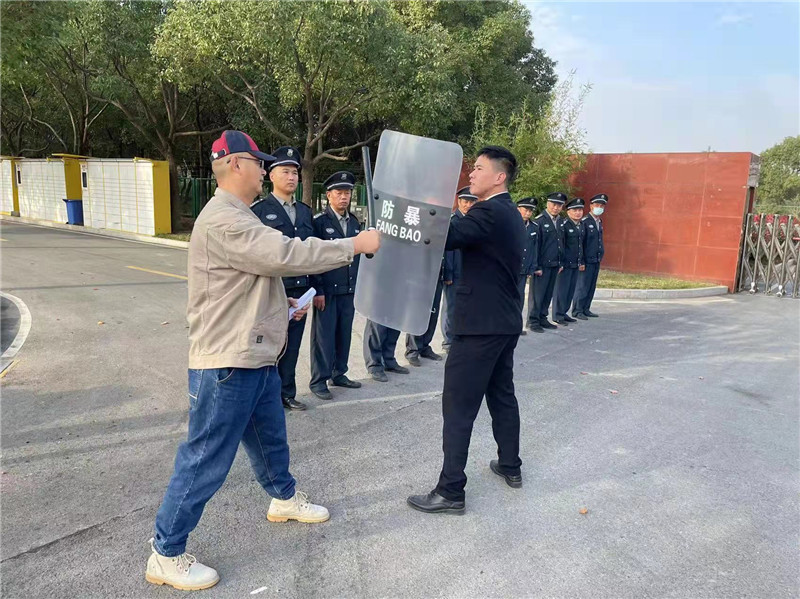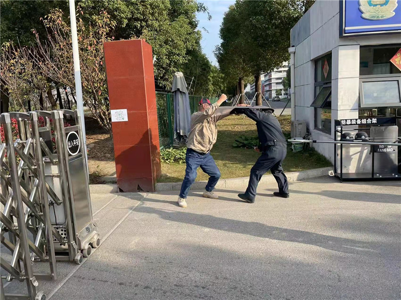 在本次防暴防恐演练中,设置演练情境,保安人员演练遇到嫌疑人时迅速冲向犯罪嫌疑人,并用钢叉死死地叉住嫌疑人的腰部,将他控制住。持盾牌、短棍的保安员密切配合,以盾牌抵挡嫌疑人,并持短棍做好“防爆”工作。在必要时刻,保安人员可用盾牌护胸,向嫌疑人喷射辣椒水,并迅速将嫌疑人制服。