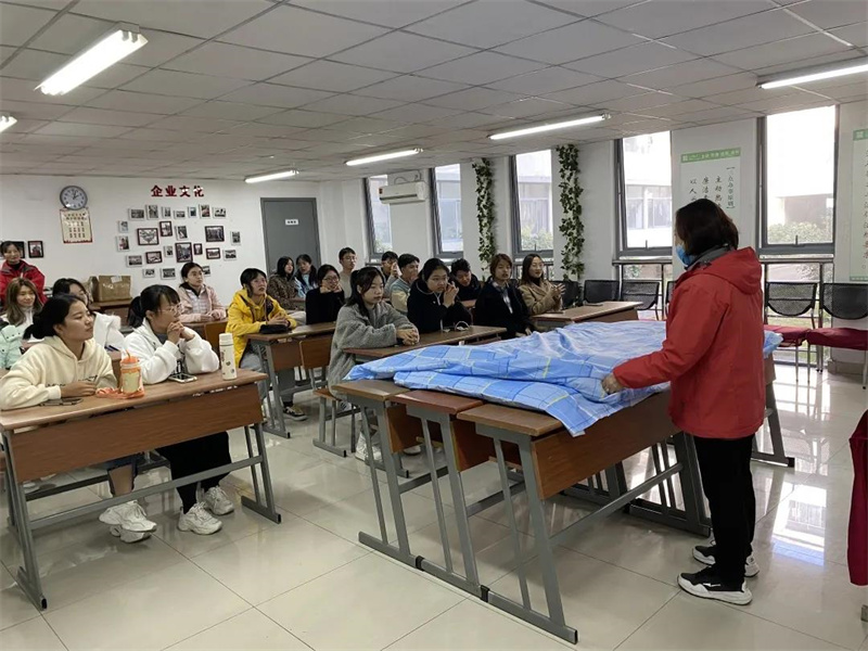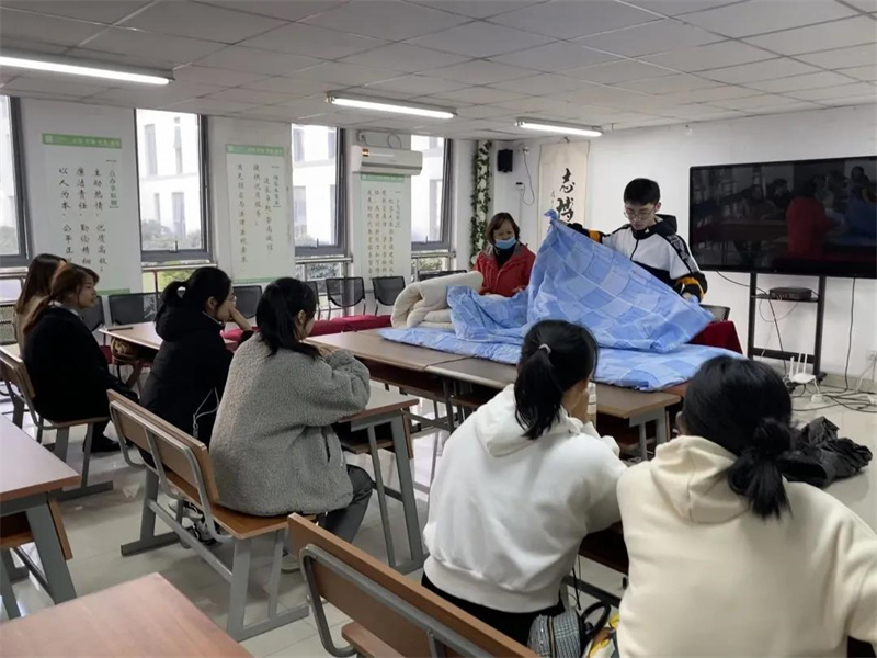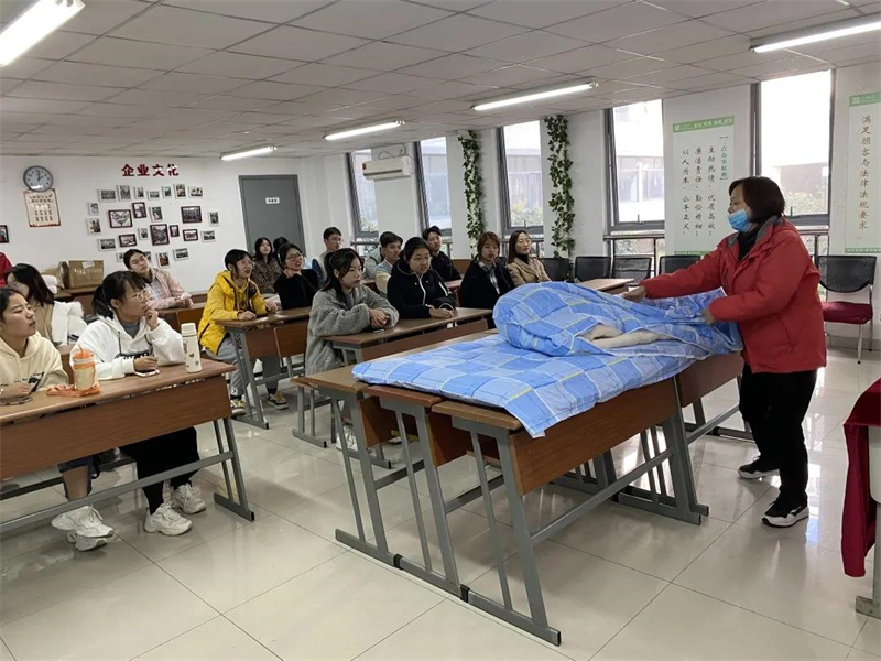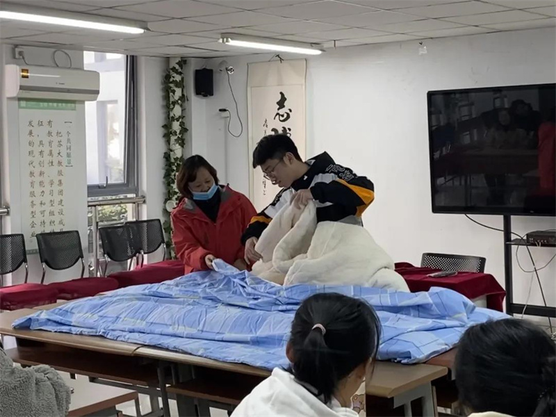 宿管阿姨向同学们讲解整理内务的必要性后,为同学们示范如何将棉胎套入被套,独特的技巧让同学们目不转睛,讲解完毕后邀请同学上台尝试。