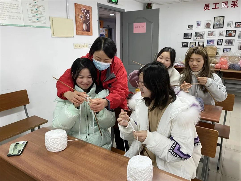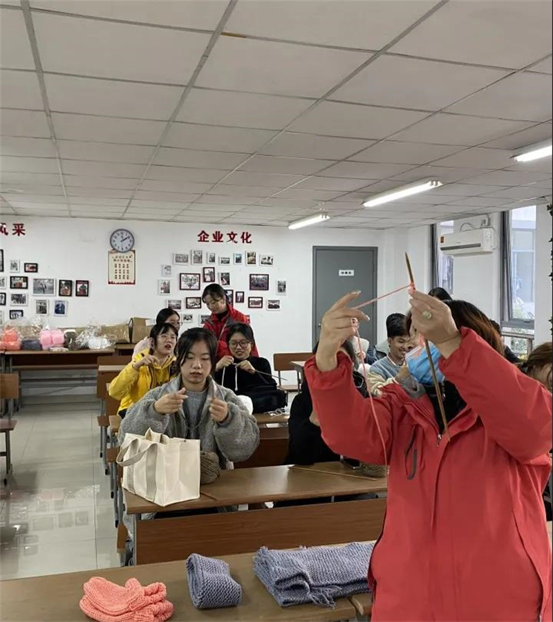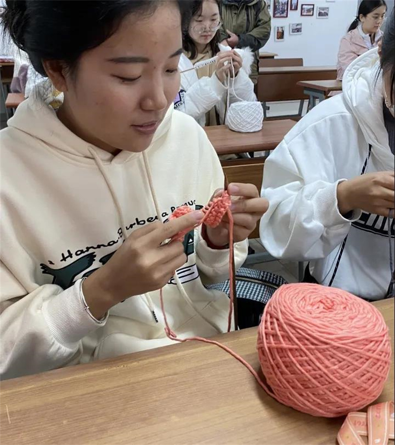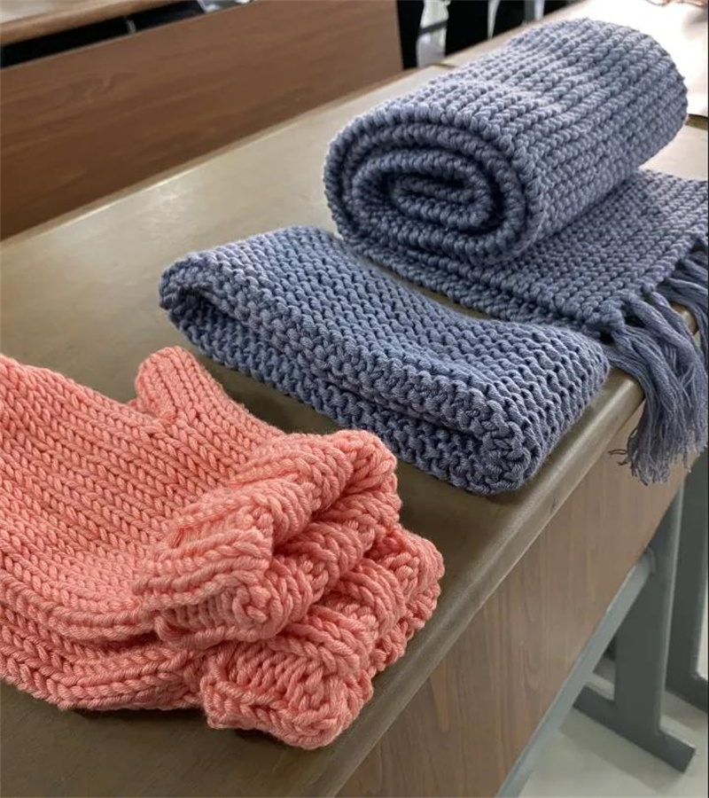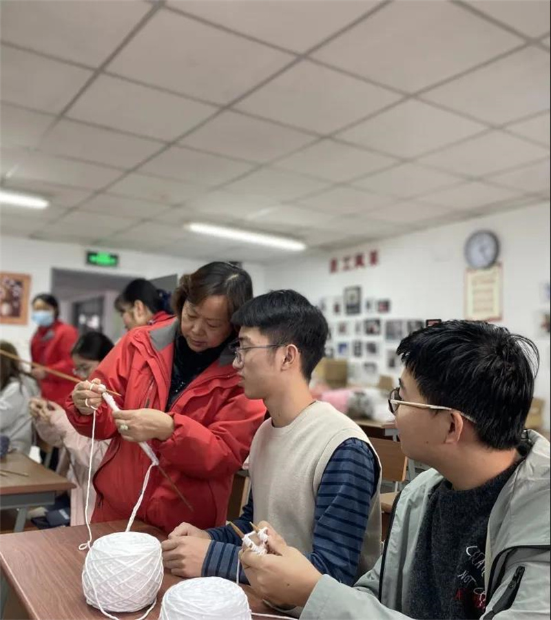 阿姨先向大家展示了提前编织好的手工成品,随后从起针手法、把握针数开始,一步一步的为同学们详细讲解织围巾的步骤技巧,遇到困难时阿姨便手把手地引导同学,同学们渐渐开始熟练