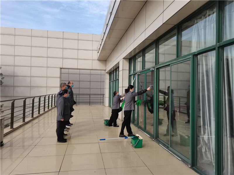 其次开展的是保洁竞赛,第一个项目是不锈钢垃圾桶的保养,首先用毛巾将垃圾桶表面的灰尘擦拭,到用洁而亮倒在海绵上对不锈钢垃圾桶表面进行擦拭,然后用毛巾在对不锈钢表面进行擦拭,最后的从细节上进行垃圾桶的擦拭。第二个项目进行的是玻璃刮拭。首先检查应清洗玻璃是否有损害现象良,然后先檫窗框。其次将凃水器完全浸泡于稀释的玻璃水中,将药剂均匀涂抹在玻璃面上,不能有过多水滴于地面。然后低位刮拭时应取掉伸缩杆,收放于地面。检查刮拭后的玻璃及无划痕及水迹。最后将工具清收整齐,放于边上。