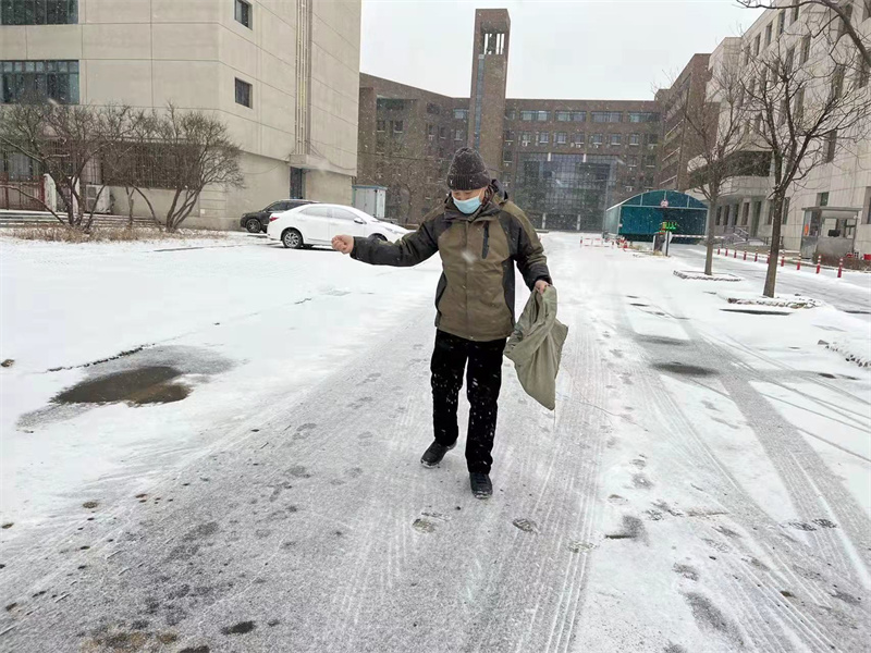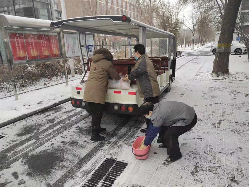 对各楼宇主要出入口、校园主干道撒融雪剂,以防积雪因温度过低导致结冰。