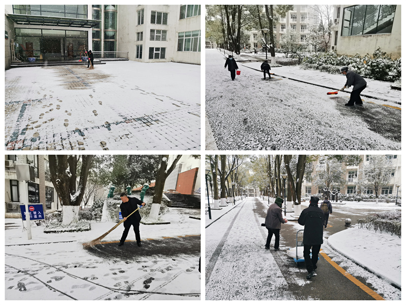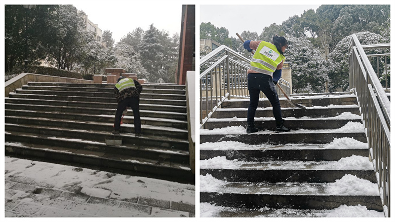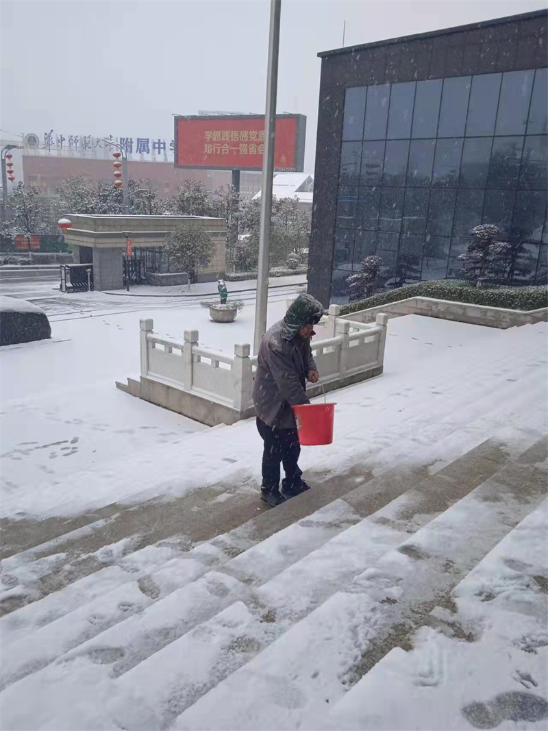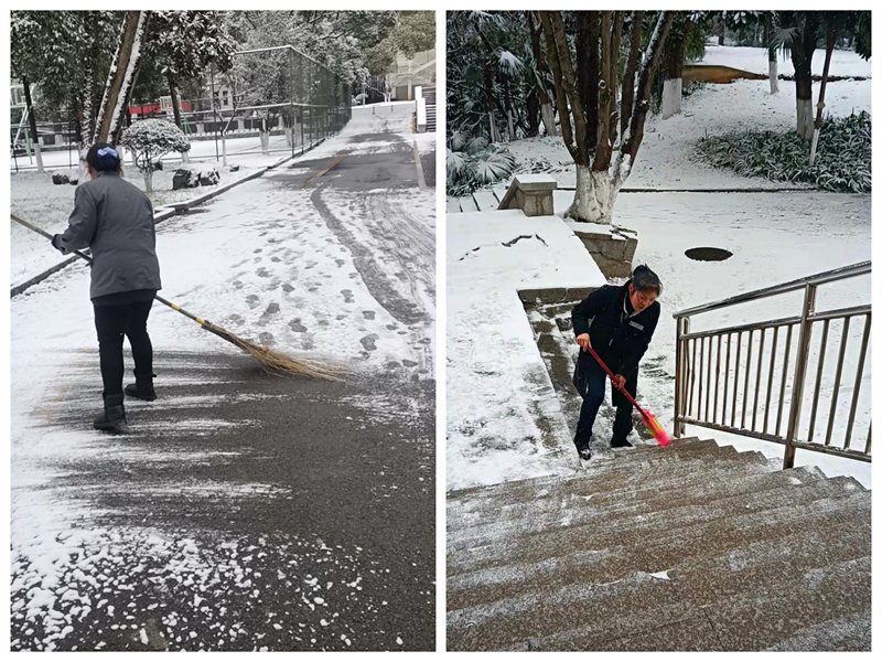 后勤管理处晏家龙处长、黄春元老师带领保洁员张仟清清扫积雪