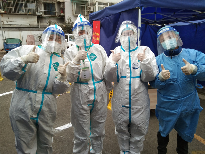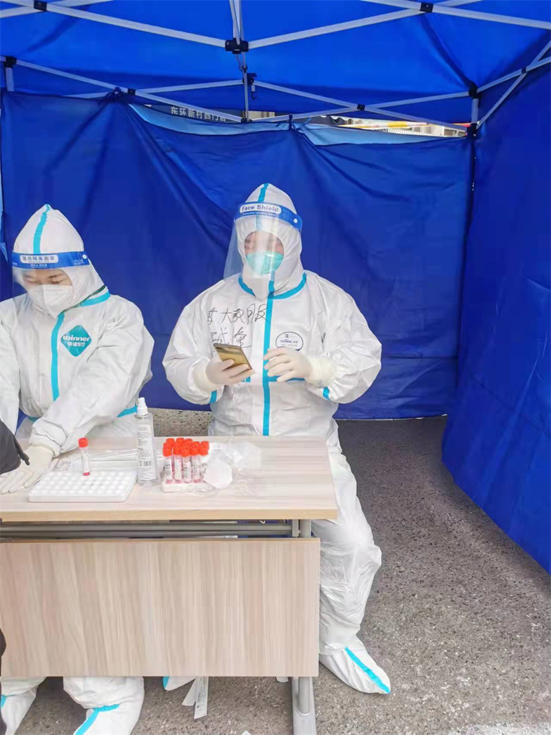 两位员工根据居委会的要求被分配到核酸检测一线——在医生旁边给居民做信息采集的工作,虽然在检测之前我们员工做了全套的防护工作,但是他们要顶着寒风为居民服务,并且要坚持五六个小时不能喝水上厕所,这份辛苦可想而知。为我们的员工能够不为艰险奋斗在核酸检测的一线鼓掌,也为奋斗在一线的医护工作者送去祝福和感激,是他们守护着我们。