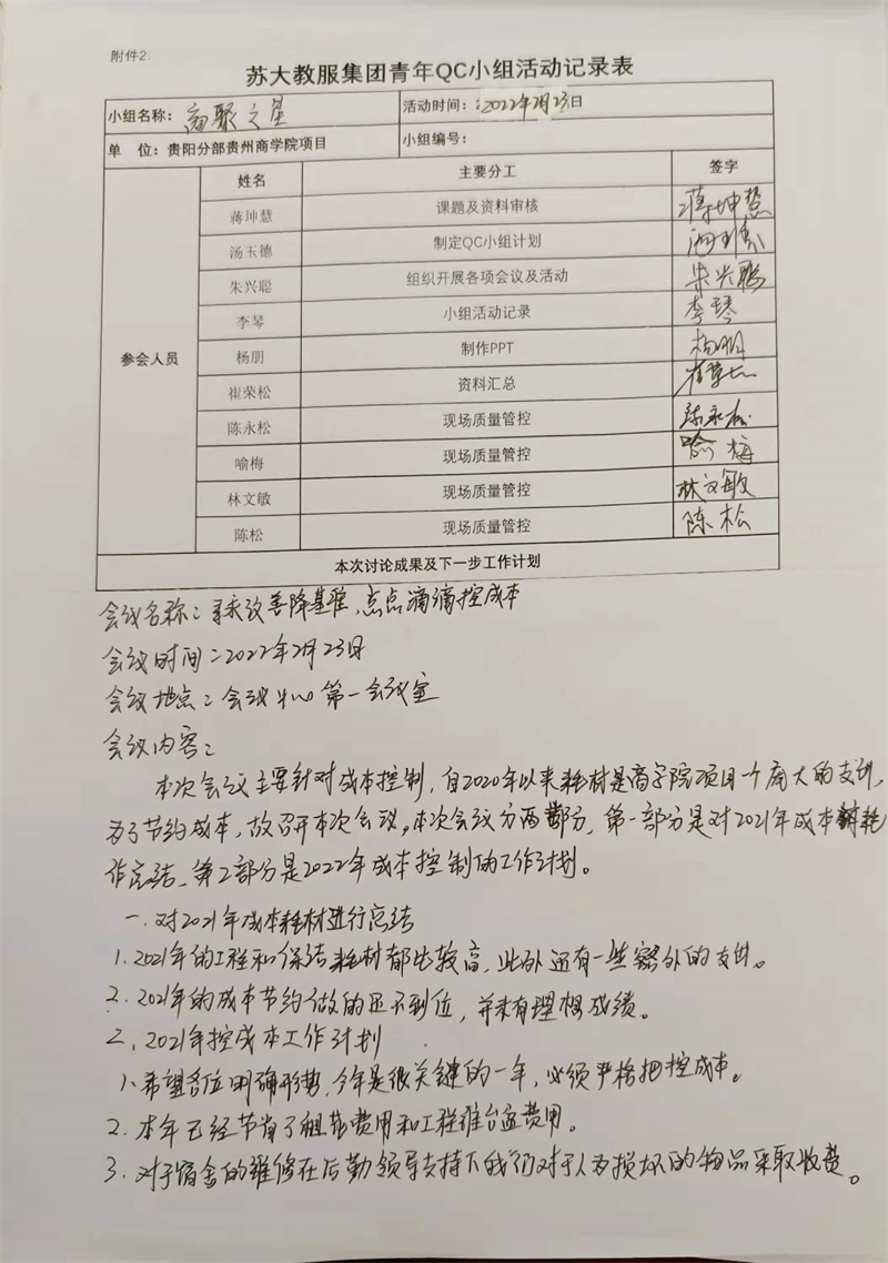 成本控制有利于提升企业效益,完善组织结构,为了有效控制成本,贵州商学院项目成立QC小组进行监督落实,2月23日下午14:30由组长朱兴聪组织召开会议,项目经理蒋坤慧主持会议。