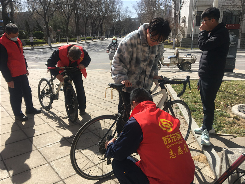 弘扬雷锋精神,我们在行动……,今年的3月4日下午、5日上午山东大学中心校区项目在蒋震图书馆下开展了“学习雷锋 服务他人 奉献社会”的活动。活动内容有:车辆养护、义务维修、爱心缝补。活动期间,有的维修师傅看到同学的轮胎气不足还主动叫住同学给其轮胎充气。为期两个半天的活动,维修养护车辆30余辆(含电动车、自行车、山地车),为学生爱心缝补衣物10余件。