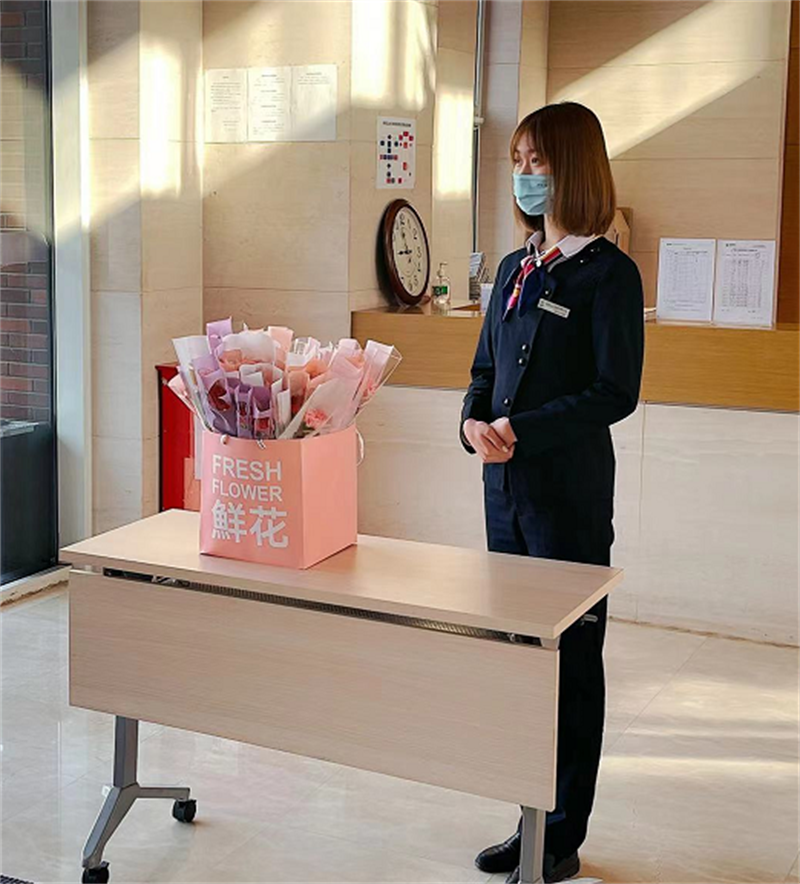 妇女节当天,我们手持美丽的鲜花,心怀满满的祝福等候在教学楼前,为匆忙赶往工作岗位的女性业主们送上节日的第一声祝福,虽然生活忙碌,唯愿你眼中总有光芒,手中总有鲜花。