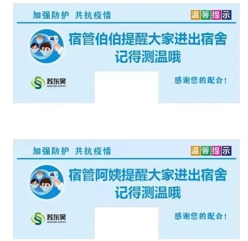 阳澄湖校区宿舍物业服务部根据学校要求及校区自身情况加强疫情防护相关工作,开放宿舍楼,值班员、保洁员每天对公共部位进行消杀,宿舍门厅内设有防疫物资、防疫贴士等,提醒学生进出测量体温、做好个人防护。
