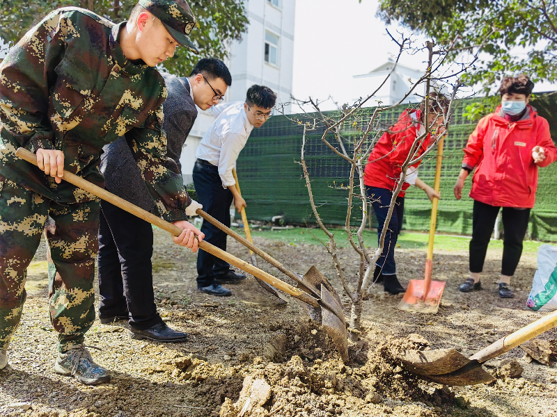 看,大家挥锹铲土、扶树正苗、浇水培土,栽下一棵棵树苗。活动过程中,三五人一组,分工合作、默契配合,到处都是忙碌的身影,植树现场呈现出一派热火朝天的劳动景象。经过一上午的劳动,种下一棵棵枫树、桃树、海棠幼苗显得格外突出,大家以实际行动履行全民植树义务,深入践行“绿水青山就是金山银山” 的理念。