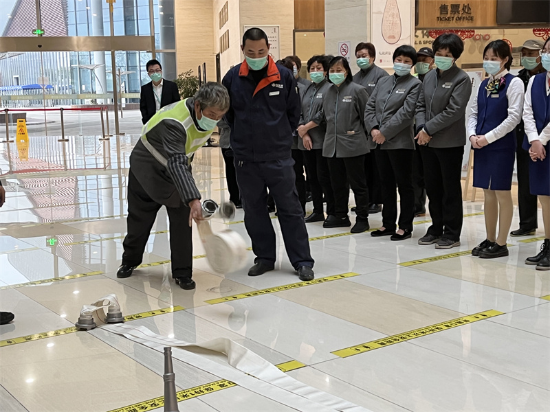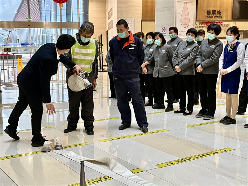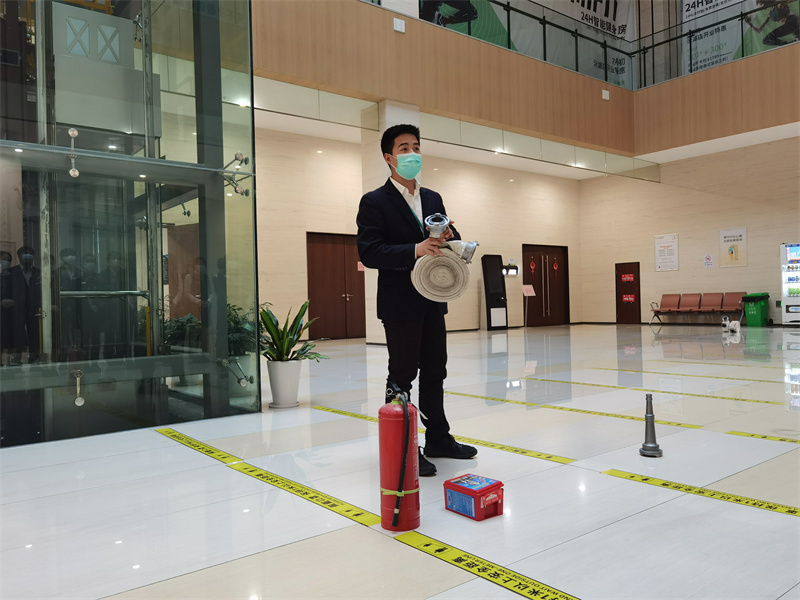 培训共分为三个环节,环节一由保安主管先为员工讲解了防毒面罩的种类、干粉式灭火器的成分、作用以及消防水带的使用方法和注意事项;环节二由保安主管为员工示范此次消防演练器具的正确操作;环节三经过保安主管的耐心细致的讲解后,一些员工跃跃欲试。随后在保安主管的指导下各条线员工相继使用消防器材进行了尝试操作,在抛掷消防水带时,这个动作虽然看起来很容易,但却不是马上就能上手。