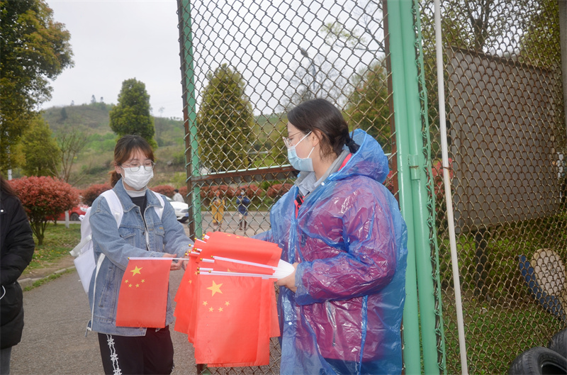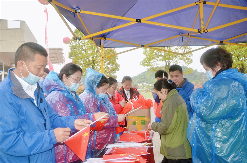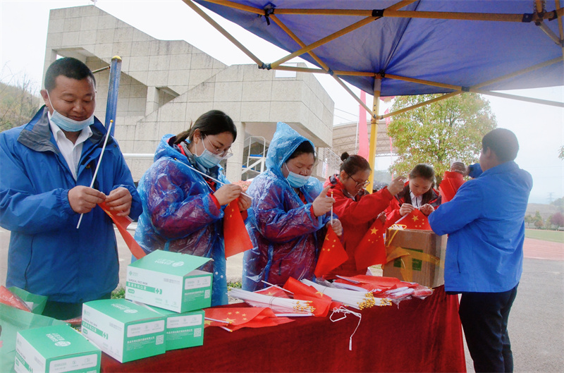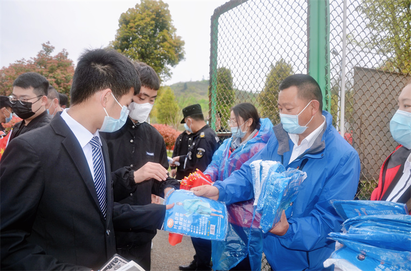 天降微雨,为我们的保障工作带来了很大的困难,项目经理蒋坤慧亲临现场做指挥,带领管理员一起给入场会员发放国旗、口罩、雨衣等物品,为誓师大会提供了强有力的后勤保障服务。