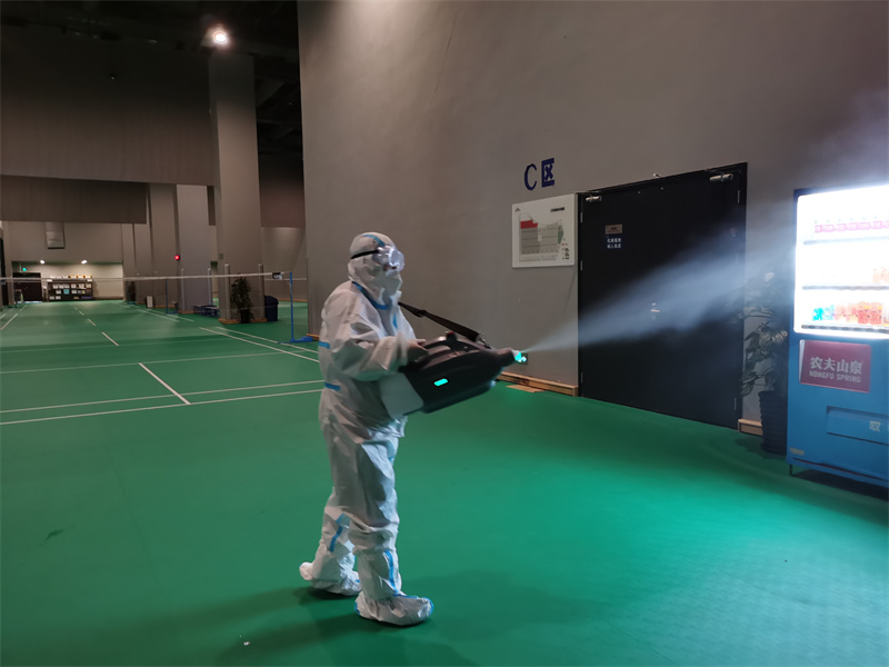 每天早晚,奥体中心消毒小队,穿上防护服背上几十斤的消毒液,根据防疫要求,对全区域进行覆盖式消毒,即便一遍又一遍来回背着消毒液累到直不起腰,他们也从未想过放弃:“作为保洁我有义务对奥体卫生负责,能为防疫工作出一份力,我很开心。”