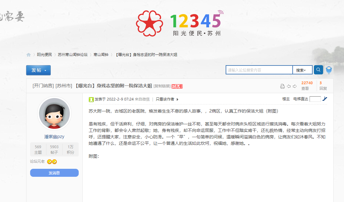 近日,医院物业一分部院区项目收到2区护士长的通知我们的保洁员赵书改在寒山闻钟上受到家属表扬,我们才发现我们的员工在政府理政平台上受到了表扬,对医院物业一分部全体员工来说是个莫大的鼓舞和赞扬。