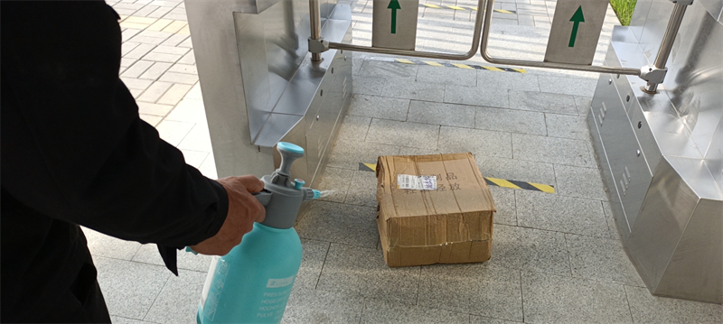 物业工作人员每日两次用84消毒液对公共区域进行全面消毒,而重点区域门岗登记台做到了每2小时喷洒一次84消毒液,来往的快递也要进行消杀处理。