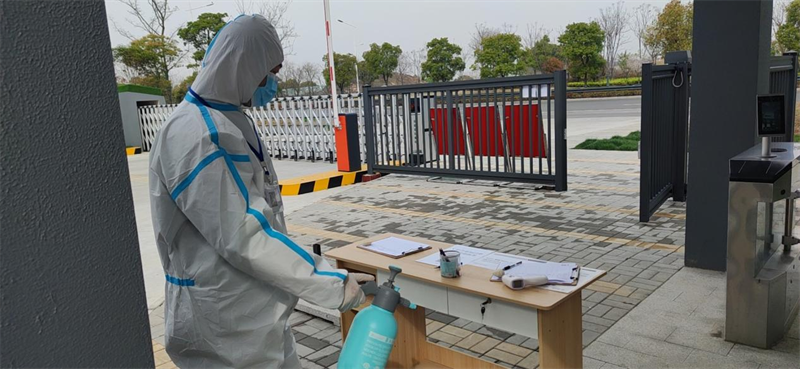 项目的门岗24小时有员工坚守,并设置测温点,检查门铃码,严格管控人员和车辆的出入。