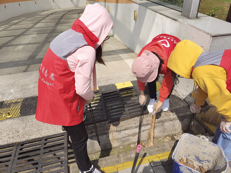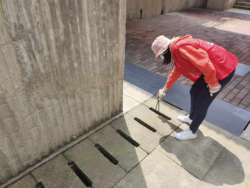 参与人员分成二组同时展开活动,第一组人员利用铁锹、扫把等工具对地下室车库排水沟进行全面清洁;第二组人员利用钳子清理排水沟内垃圾、对绿地内的杂草杂物进行全面清除;