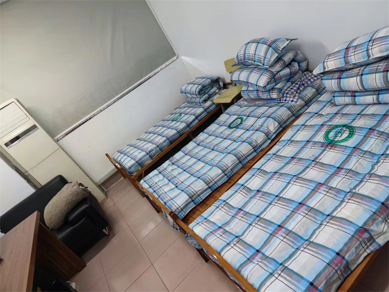 自动员大会起,管理员、楼宇值班员、宿舍值班员、保洁员离开嗷嗷待哺的幼儿、年迈的双亲,带上简易的行囊,坚决毅然投入到这场没有硝烟的战争。项目用一整天的时间,整理出休息的房间,安装了几十张床,分发相应的床上用品。项目给每一位员工做好相应的个人防疫及相关工作的培训。管理员每日2次对在校员工进行体温监测,手机APP进行个人健康填报。保洁员化身大白,做好校园内各个区域全覆盖消毒。宿舍值班员密切关注楼内学生的动态,及时留意、关心学生的动态,密切与校方沟通,共同抗疫。楼宇值班员做好每日核酸检测现场布置及秩序维护工作,站好一米线,保持安全距离。