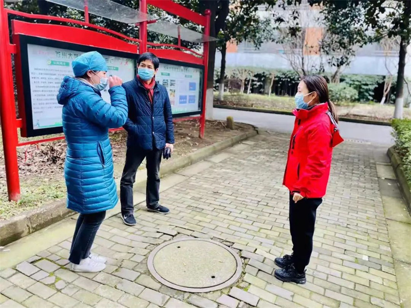 检查防疫工作 苏州本轮疫情开始后,学校领导多次前往各校区,检查各项防疫部署工作落实情况。 苏州大学党委副书记王鲁沛,党委常委、副校长姜建明,以及后勤管理处处长仇玉山,在校医院院长朱旻的陪同下,来到后庄,现场了解核酸检测点的运行情况,并鼓励宿管员工做好服务工作,把好事做实、做长久! 苏州大学后勤管理处副处长殷为民对核酸检测等疫情防控工作进行现场指导。提醒大家在做好核酸检测保障工作的同时,也要做好自身防护,并加强日常消杀、通风、测温等工作。 慰问服务企业员工 夜间,苏州大学后勤管理处副处长殷为民多次前往服务企业员工宿舍进行慰问,了解住宿员工的需求,对于勤恳付出的服务企业人员表示认可,叮嘱员工做好个人防护。同时提醒住校员工遵守住宿规定,杜绝各项安全隐患,并对大家的辛勤付出表示感谢。 发放慰问酸奶 为鼓励奋战在苏州大学校内疫情防控一线的后勤保障服务人员,苏州大学后勤管理处副处长殷为民给各项目员工分发慰问品。 宿管人员在收到慰问物资后心里暖暖的,疫情总是有终点的,胜利就在前方!