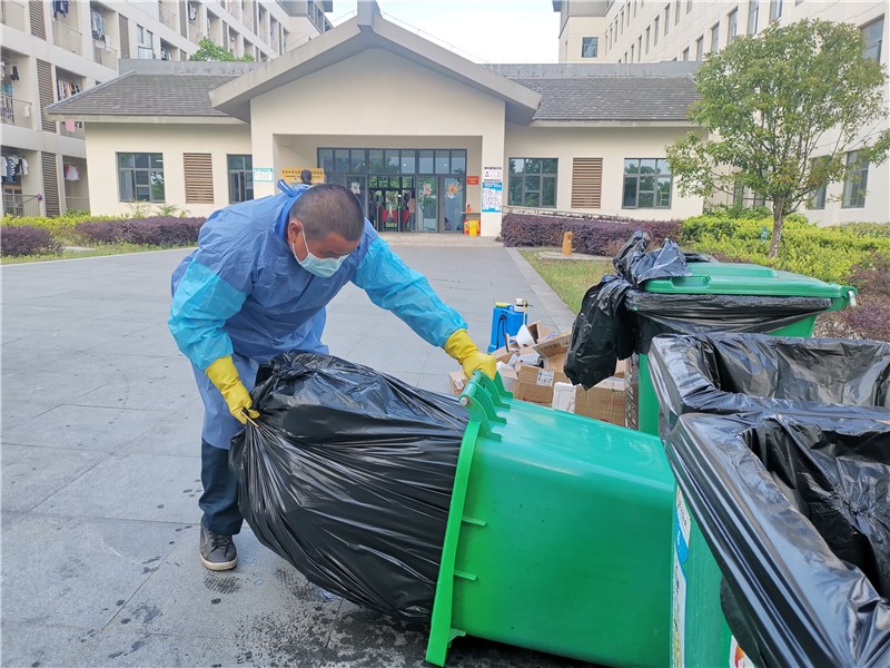在抗疫号角吹响的那一刻起,镇江高专项目部全体员工就投入到校园工作中,坚守在自己的岗位上,冲锋向前,践行使命。这次封闭管理中,外保洁任年生义无反顾留守在防疫一线,拜托亲戚照顾家里行动不便的老伴,全天候坚守岗位。每日校园清扫保洁和垃圾清运工作是重中之重,为了保证垃圾的日产日清,任师傅每天早上5点半就开始不间断的到每个宿舍楼下拖运垃圾,一直忙到晚上8点多,每天工作十几个小时。校园里还有许许多多的默默奉献的物业人,他们是校园勤劳的服务者,更是站在一线的抗疫战士。