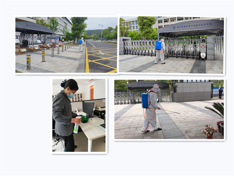 项目安排每日对校园办公室、卫生间、教室等公共区域进行全面消毒,消毒液专人配制,根据公共区域、卫生间、垃圾中转站等环境卫生不同,消毒液浓度不同,有效消杀病毒;每周统计项目全体员工苏康码、行程码、疫苗接种、核酸检测情况,跟踪员工健康检测;员工保持学校、家“两点一线”,非必要不离苏,离苏前需报备;凡进入校园所有人员(包括学校教职工)加强测体温、查双码;外来施工、来访人员必须汇报校领导批准进入,必须测量体温,检查双码+24小时内核酸阴性证明,拍照发后勤群报备,做好登记,手和接触物品消毒;在校园工作人员一律佩戴口罩,安排专人检查督导。