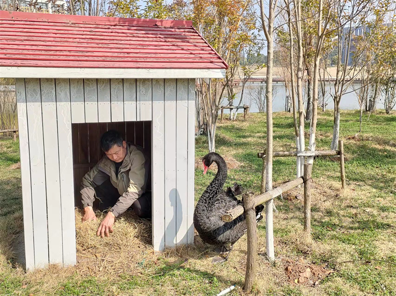 “1、2、3……”东吴服务产业集团的饲养员杨光志一边撒着手中的卷心菜、一边点着天鹅的数量。他是合工大宣城校区景明湖的专职天鹅饲养员。