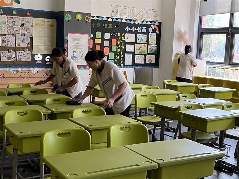在暑假中,为了给同学们一个更加光线充足的学习环境,学校对小学部的教室及外部建筑做了一个改造,同时进行的还有图书馆的工程。如此一来,保洁阿姨的工作显得非常辛苦。在炎热的天气里,阿姨们扫灰,拖地,擦桌子和柜子以及公共区域的书架,清洗玻璃,大门等等,工作中汗流浃背,筋疲力尽。为了给学生们腾出教室,项目人员要把四楼的乐器搬到一楼,在一层一层的接力中,终于把四个教室的乐器集中到了一楼,大家一时间累得气喘吁吁。在开学的前几天,学校还有其它的器材要搬运工作,项目人员始终奋战在一线,为新学期的开学工作贡献着自己的一份力量。