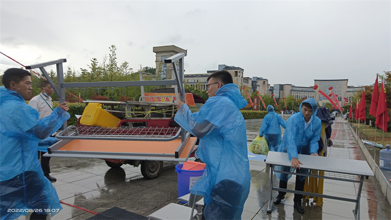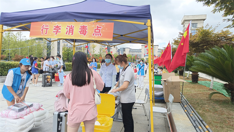 因为25日开始就陆陆续续有新生前来报到,作为疫情防控的第一个岗,24日晚18:00当天值班人员就立即搭建帐篷,设置好行李消毒点,严格落实疫情防控要求,把好师生的健康关,校党委书记、院长亲临现场指导迎新消毒工作。