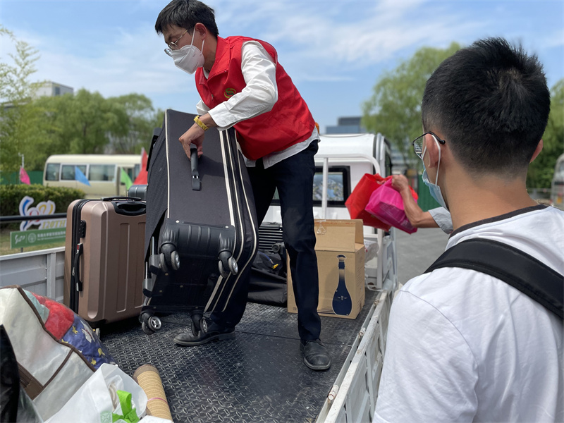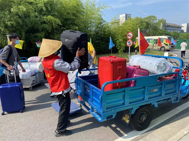 项目部人员身着红色志愿者马甲,在校门口车辆指引、人员扫码登记、协助搬运行李等,热情的物业人积极组建服务车队,为新生接驳行李提供便利,获得家长学生一致好评。
