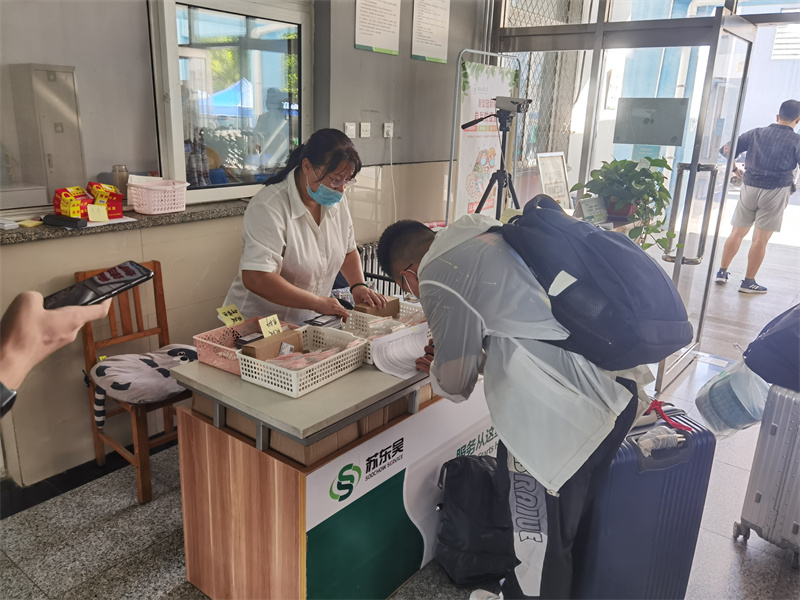 随着宣传指引标识、咨询服务点、服务接待现场等布置完成,迎新准备工作一切就绪。项目部给新生提供免费饮用水、饼干、纸巾、糖果、应急医药箱等物品。
