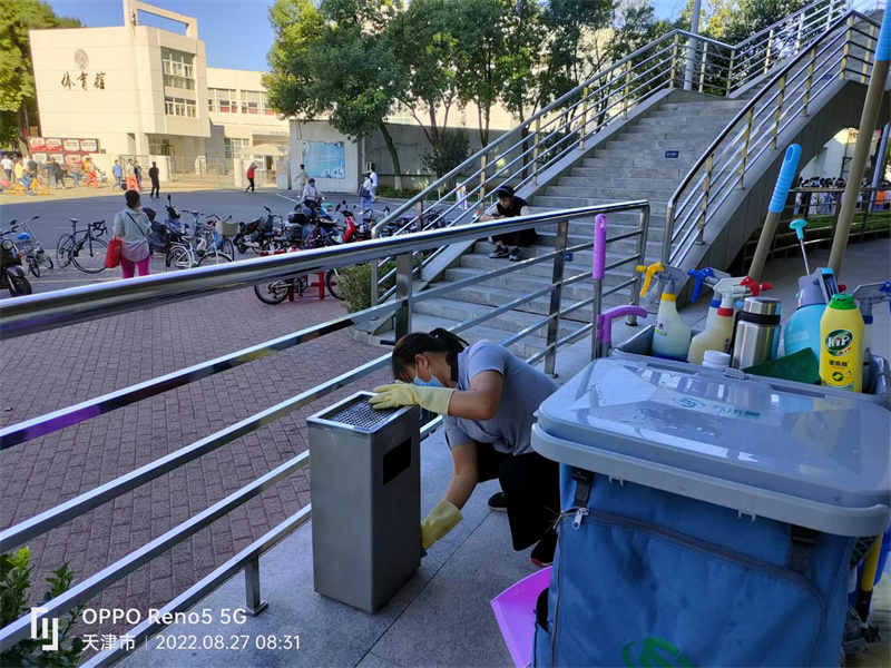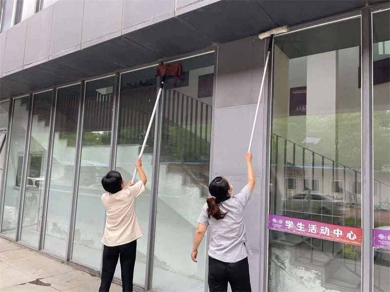 在做好学校各重点区域的消杀工作的同时,同时组织保洁员集中对区域进行大清扫,认真做好宿舍楼、办公楼清洁,清洗外墙玻璃和体育场地面,让校园焕然一新,来迎接新同学。