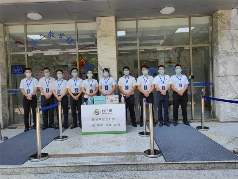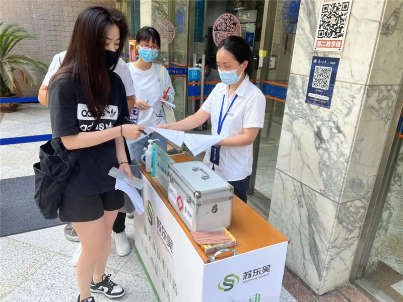 为全力做好枫林校区考点服务保障工作,项目部在考场入口设置有“苏东吴爱心助考服务台”,免费提供2B铅笔、电池、一次性医用口罩、免洗手消毒液、考试材料打印以及配备了应急医药箱等服务。