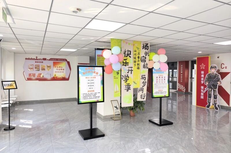 新生宿舍楼大厅设置主题打卡框,印有“欢迎新同学”“开启青春新篇”等标语,在女生宿舍楼还有精美大蝴蝶结做装饰,方便新生与家长拍照留念,记录入学美好瞬间。