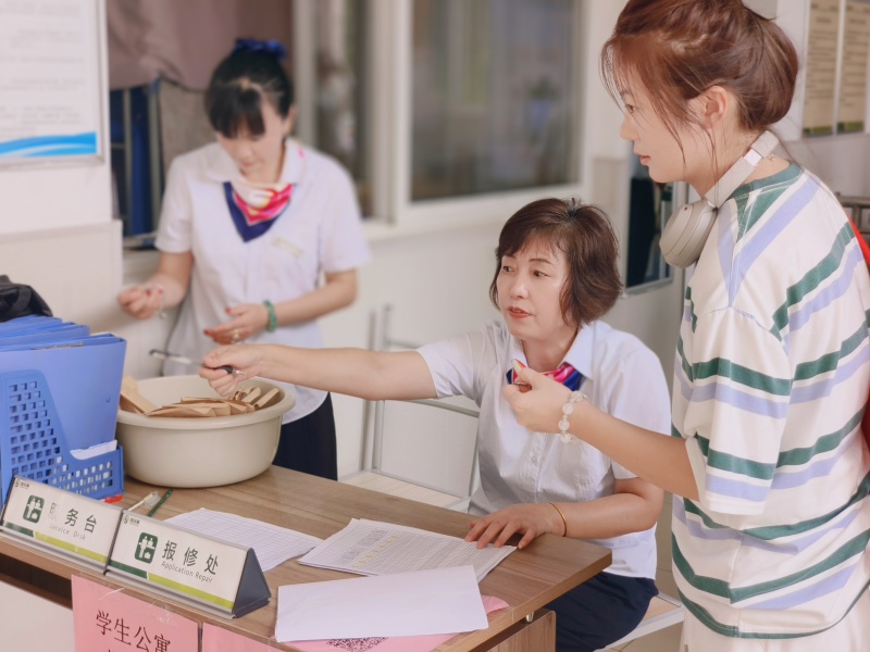 宿管阿姨在耐心办理完各项手续后,还会贴心地帮助学生搬运行李,并告知学生,宿舍如果有需要维修的,可直接到服务台报修。