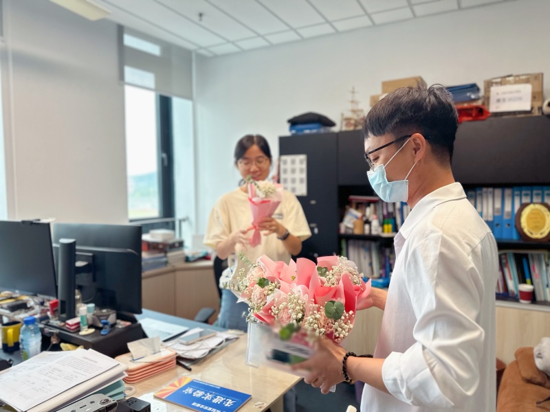 活动筹备阶段,项目部提前采购数百束新鲜康乃馨——其淡雅花色与馥郁香气,恰如其分传递着“感恩与敬意”。活动当天,现工院一楼服务台被打造成温馨的“教师节鲜花领取点”,项目工作人员全程引导教师有序领取;同时项目经理刘倩带队,将包装精美的花束逐一送至教师办公室,让老师们在忙碌的工作间隙收获意外惊喜与感动。