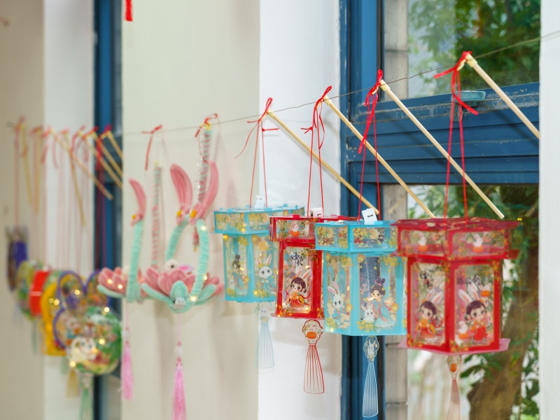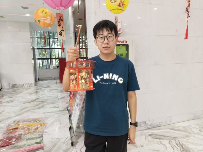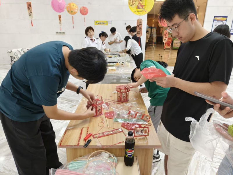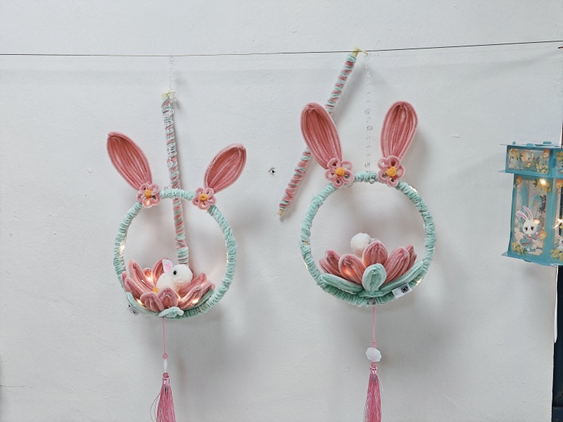 隔壁的花灯制作区同样热闹非凡。竹圈、彩纸、流苏、LED 灯串等材料整齐陈列,处处透着井然有序。宿管阿姨们各显神通:熟稔花灯制作的阿姨,手指翻飞间便搭好精巧骨架;另一边阿姨则与同学们合作,用扭扭棒制作萌趣灯兔,悄悄将 “祝祖国繁荣昌盛” 的美好祝福藏进灯兔里,让这份心意随花灯一同点亮。很快,一个个造型别致的花灯相继完成,点亮灯串的瞬间,暖光摇曳,节日的浪漫气息扑面而来。