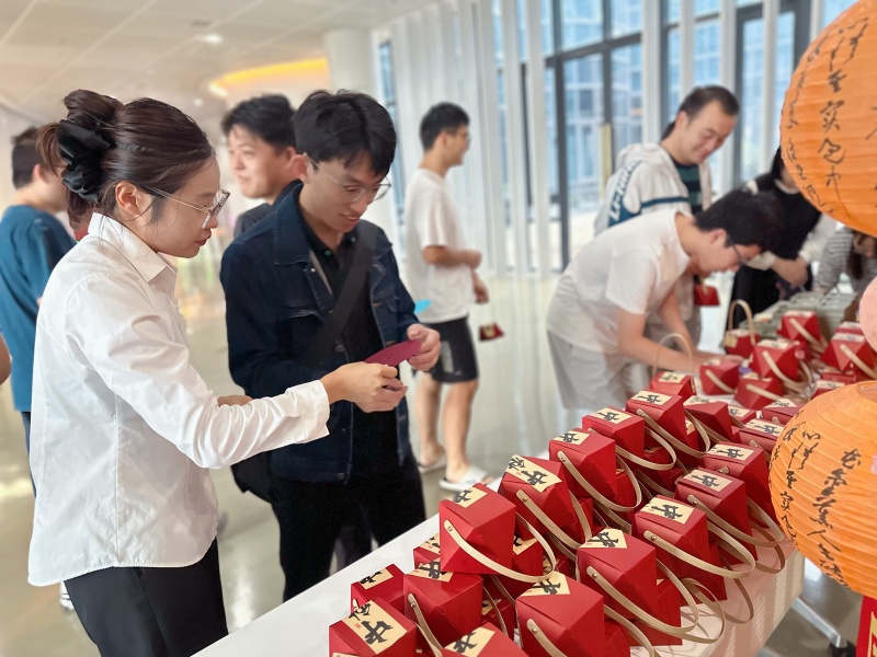 随着活动正式开启,师生们踊跃参与,纷纷驻足服务大厅拿起画笔。无论是笔触稚嫩的学生,还是手法娴熟的老师,都沉浸在创作中,一笔一划勾勒中秋意境,将对节日的期盼与美好祝愿融入作品里。短短时间内,一幅幅色彩鲜明、充满童趣与创意的中秋画作陆续完成,生动展现了大家心中的中秋模样。完成作品后,参与者还能从奖品中任选一份一份中秋挂件或月饼礼盒,手捧礼物的瞬间,笑容里满是节日的幸福。