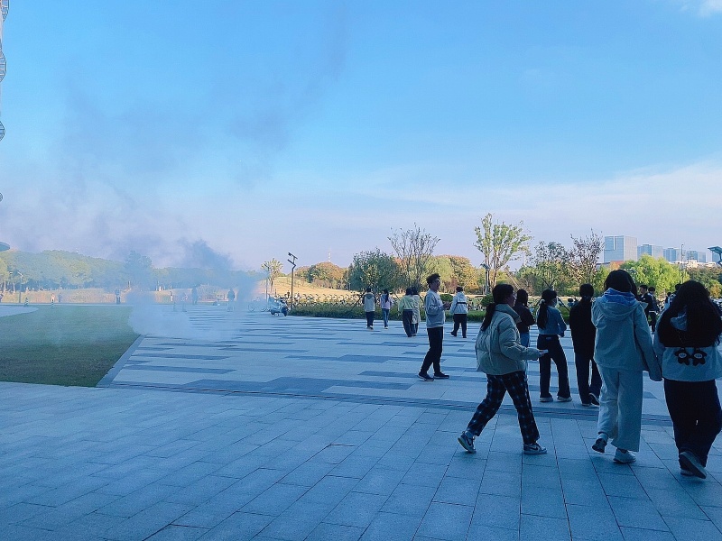 11月10日15时许,项目部提前通过广播提醒:听到火情广播时请勿惊慌,需配合工作人员有序疏散。15时30分,工作人员在指定点位点燃模拟火情烟雾弹,模拟火灾警报随即响起,实验楼一期演练正式启动。项目部及保卫处消防科人员第一时间响应,迅速切断楼内电源,启动应急广播引导师生保持冷静、有序撤离。疏散引导员在大楼出入口、楼梯口等关键位置值守,指引人员用湿毛巾捂住口鼻、低姿弯腰,沿安全通道快速撤离。仅用时3分钟,楼内所有人员便全部安全疏散至指定集合区域,随后防火门缓缓下降并完全关闭。