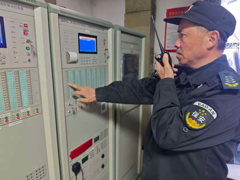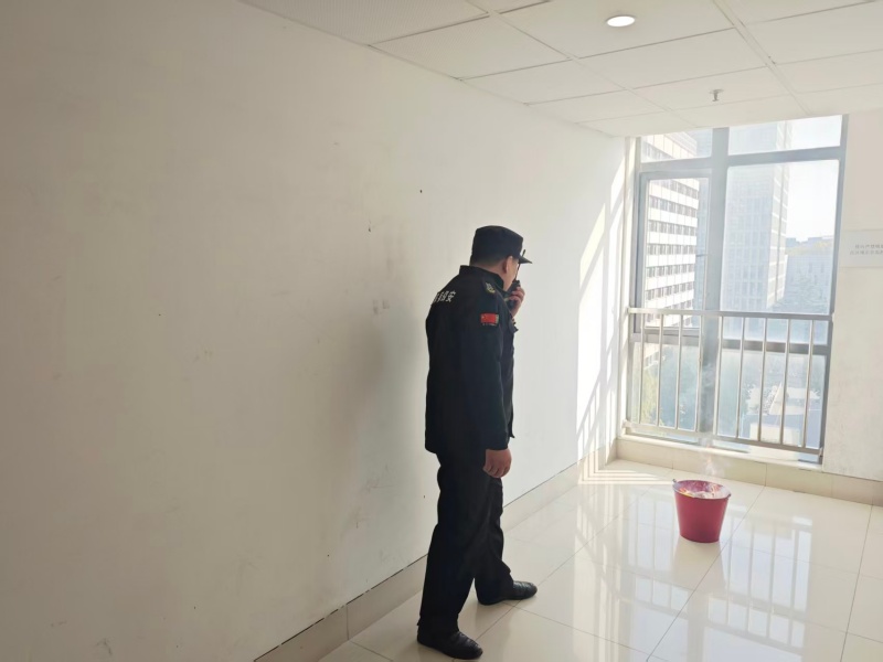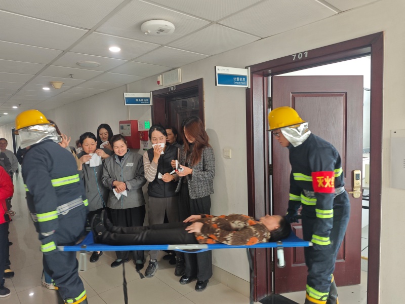 10:00,演练正式拉开序幕。现场模拟烟气触发楼层感烟探测器后,声光报警器同步启动,消防控制室第一时间接收报警信号。值班人员迅速锁定报警区域,立即调度巡逻保安携带通讯设备赶赴现场核查火情,同时启动应急救援预案,集结第二梯队救援力量,同步开展消火栓系统等支援工作。此时,火情模拟房间内烟气浓度持续升高,一名工作人员模拟被困且行动不便,灭火救援组迅速响应,采用担架转运方式高效处置,成功将被困人员安全转移至指定安全区域,整个救援过程紧张有序、衔接顺畅。