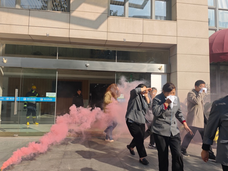 与此同时,消防应急广播同步启动,循环播放应急逃生指引。全体师生在安全员的专业引导下,迅速用湿毛巾捂住口鼻,保持弯腰低姿姿势,沿预定疏散路线快速有序撤离至大楼前空旷安全区域。整个疏散过程动作规范、衔接紧密,仅用短短几分钟便完成全体人员的安全集结。