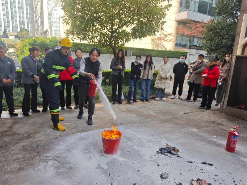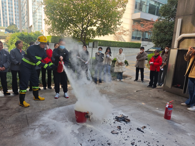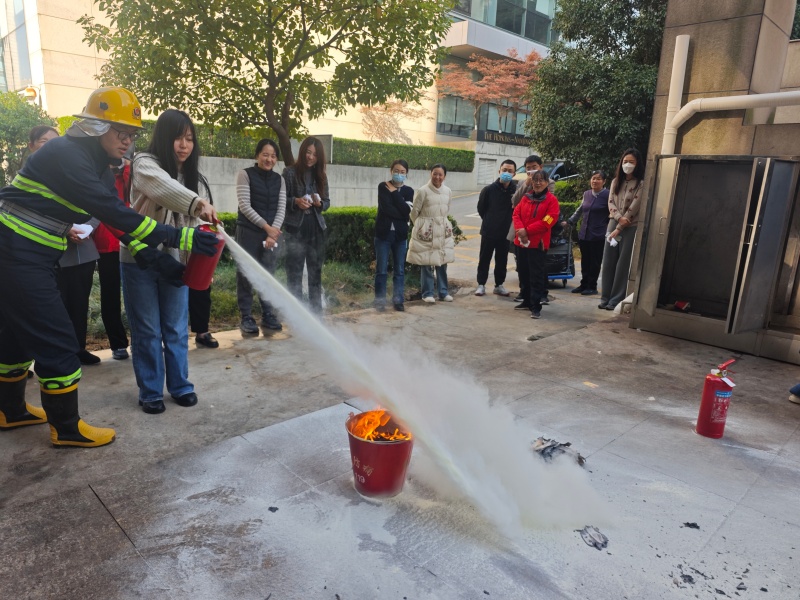 在楼外安全区域,项目负责人结合实操需求,现场讲解灭火器使用“四字要诀”:提手柄、拔保险、握喷管、压把手,强调需对准火源根部扫射,即可高效处置初期火灾。随后,灭火组点燃模拟火源,现场示范灭火器实操技巧,重点明确“上风向站位、对准火源根部、保持 3-5 米安全距离”等关键要点。