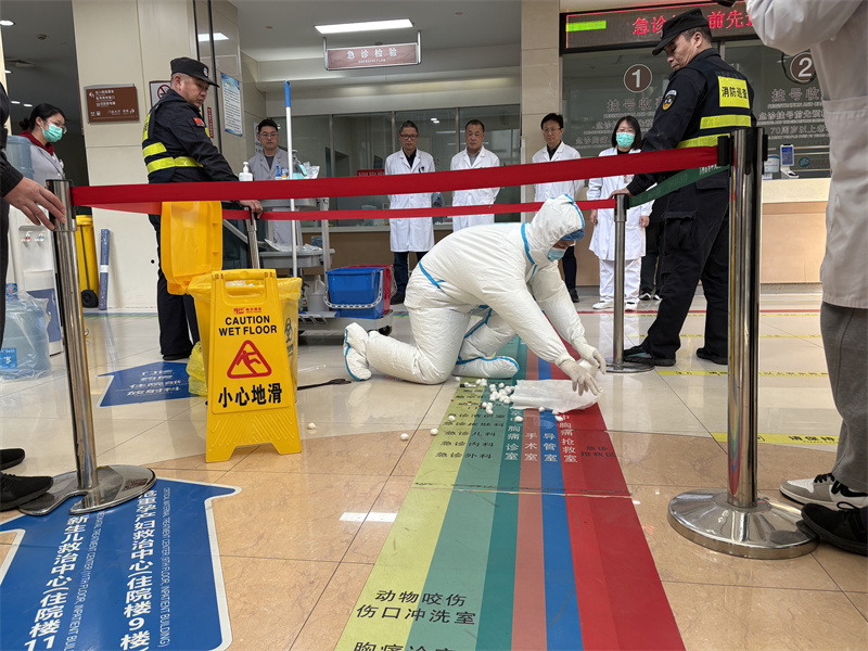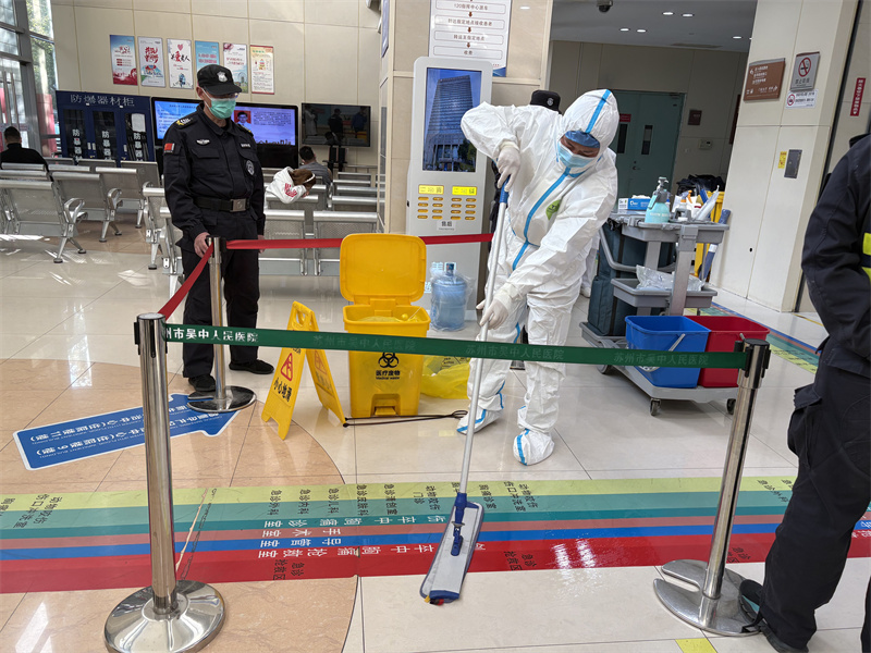 为切实保障服务医院的环境安全与卫生,全面提升我司保洁团队应对突发事件的实战能力,2025年11月26日下午,吴中人民医院项目部在院方的指导下,成功组织并完成了一场模拟医疗废物泄漏的专项应急演练。本次演练全面检验了我们保洁员的应急处置水平。