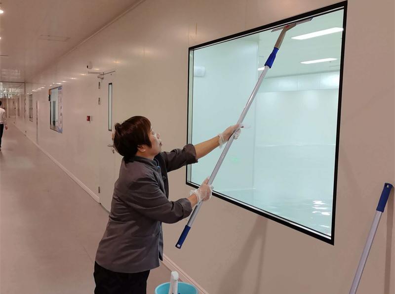 针对参访重点微纳实验大楼,保洁团队提前介入,严格遵循预定参观路线,对大厅、走廊、玻璃幕墙及地面等区域进行了无死角的深度清洁,确保每一处细节都光洁如新。