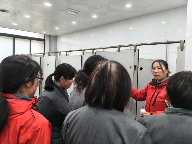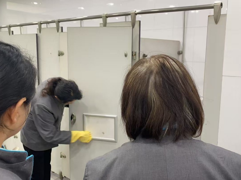 下午的实战教学直接把课堂搬到了楼道、电梯、卫生间等工作一线。从玻璃擦拭 “无水痕” 的核心秘诀,到电梯不锈钢的精细化保养细节;从卫生间龙头、蹲坑的深度清洁技巧,到不同材质、不同污渍对应的药剂选择与工具搭配…… 专家团成员手把手耐心指导,将每一个操作动作细致分解,确保大家学懂弄通。