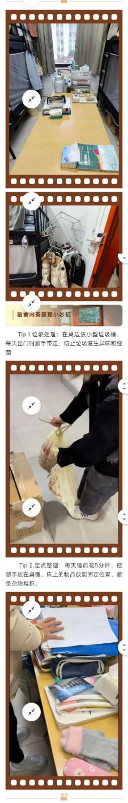 午后阳光斜斜洒进宿舍,镜头先怼向堆满零食袋和凌乱书本的桌面,紧接着几位同学手脚麻利地行动起来:有人把衣物叠成方方正正的“豆腐块”,有人用收纳盒将笔具、护肤品分门别类归置,还有人蹲在地上擦净地板的污渍。随着镜头二次对准,原本杂乱的宿舍变得窗明几净,拍摄的同学笑着晃了晃手机,嘴里念叨着“这前后对比也太震撼了”。