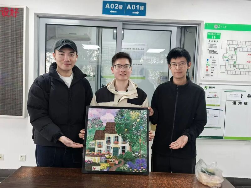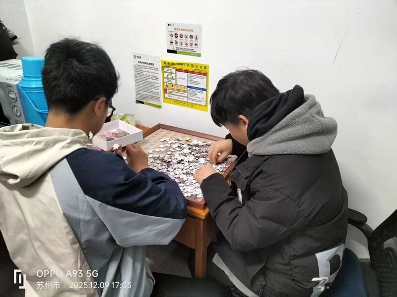 活动区的拼图板前,一组四人宿舍围得水泄不通:有人跪坐在地,手指飞快扒拉着散落的拼图块,嘴里嘟囔着“这块是宿舍的窗户吧?”;有人踮着脚凑近参考图,眯着眼比对边角的图案;还有人举着一块拼图,猛地往板上一扣,大喊“对上了!”,话音刚落,同伴们立刻发出一阵欢呼,连旁边组的同学都忍不住回头看过来。