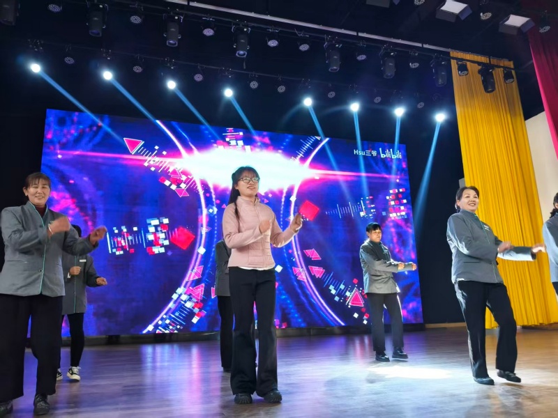 润园陈贵娇阿姨的红绸扇舞《梅花三弄》柔婉如柳,尽显古典韵味;沁园鲁胜文与龚智翠演绎的《热辣辣》活力四射,点燃全场热情;体育馆杨主管带领6位阿姨带来的健身操整齐划一,动作标准如复制粘贴;教学楼赵丽怀抱吉他弹唱《欢乐颂》,小小身影里藏着大大的能量,勇敢绽放的模样格外动人。