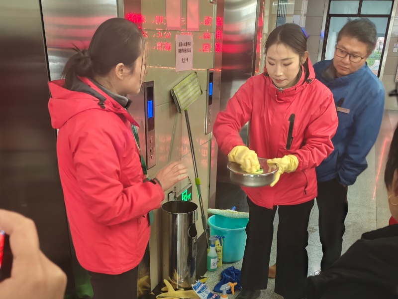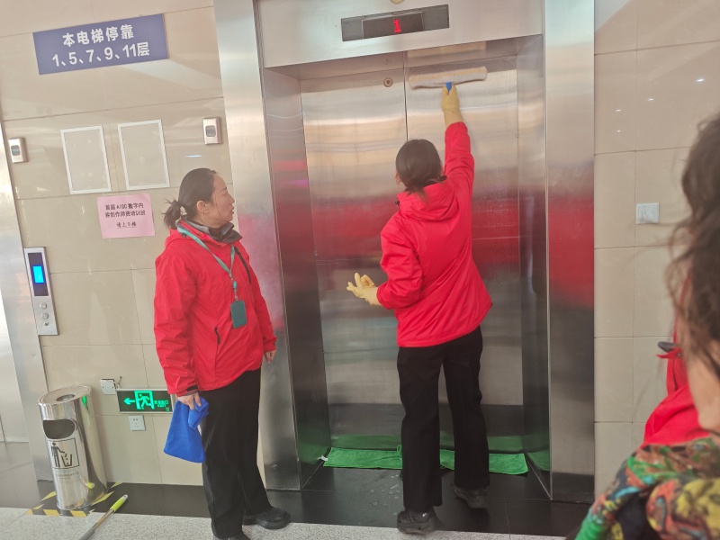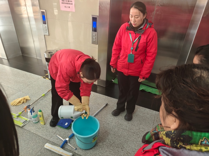 实操演示环节将培训氛围推向高潮。参训人员分组开展电梯精细化清洁、玻璃无痕清洁等实操训练,在骨干人员的一对一专业指导下,亲身实践标准化操作流程,精准把控清洁力度、操作节奏与细节要求,有效实现理论知识向实操技能的转化,显著提升了规范作业能力水平。