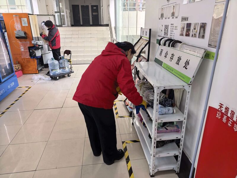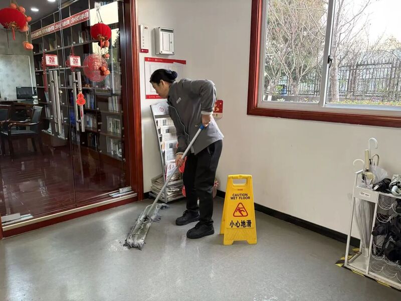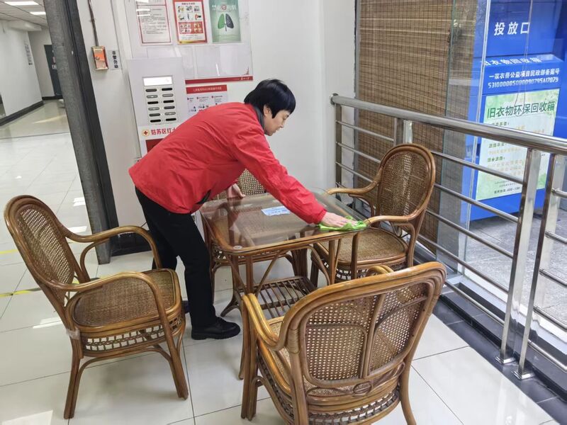 保洁人员每日定时清洁宿舍公共区域,仔细打扫每个角落,特别加强对门把手、楼梯扶手等高频接触部位的消毒工作,为同学们维护整洁卫生的居住环境。