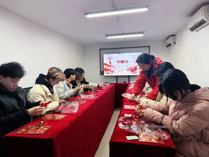 宿管阿姨们还在活动室准备了红色丝线,带着同学们一起编织中国结。同学们围坐桌前,从生疏到熟练,一根根丝线渐渐变成寓意吉祥的盘长结、如意结。暖黄的灯光下,笑语与丝线交织,传统手艺在年轻的手中延续。
