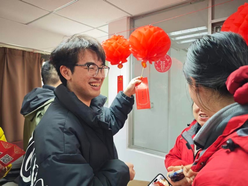 主会场内设置幸运套圈、灯谜竞猜、心愿墙三大趣味互动区域,各区域人气满满、热闹非凡。幸运套圈摊位前,同学们手持套圈凝神瞄准、快乐投掷,在欢声笑语中赢取年味装饰品、中国结、小灯笼、小狮子挂件等精美礼品,收获满满惊喜;灯谜竞猜区红灯高挂、谜面纷呈,涵盖民俗知识、趣味谜题的灯谜吸引学子们驻足思索、踊跃抢答,在沉浸式猜谜中感受传统民俗的独特魅力;心愿墙前,同学们认真写下新学期的奋斗目标、美好期许,也积极留下对公寓服务的宝贵建议,贴上专属纪念贴纸,让美好心愿在元宵佳节悄然启航。