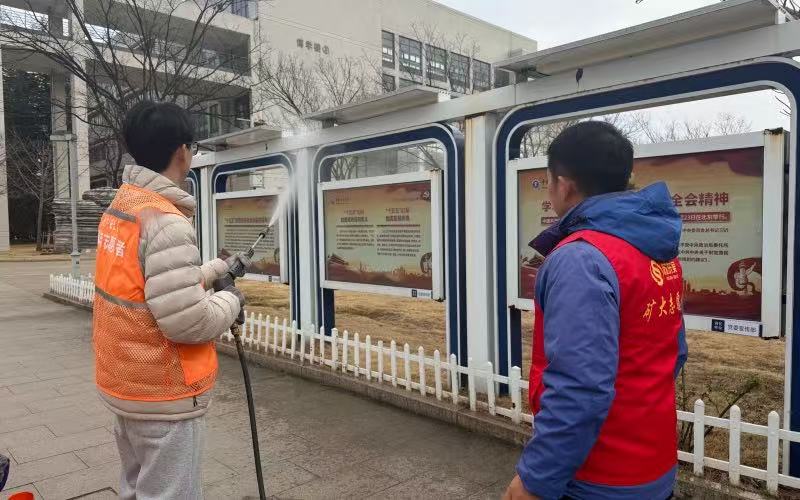 本次活动聚焦校园环境整治提升,涵盖烟头清捡和公共设施冲洗等实践环节。全体人员分组协作、干劲十足,身着志愿马甲的身影成为校园中一道靓丽的风景线。